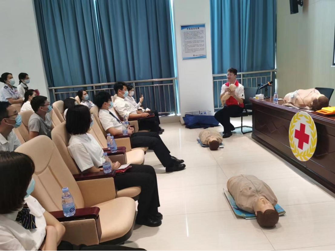 培训现场,红十字会救护讲师黄少正用风趣幽默的语言,结合生动的案例讲授了救护基本知识、救护概论、心肺复苏、AED使用、创伤救护等详细内容。