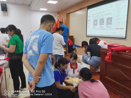 在培训过程中,红十字会应急救护师资邓慧敏为大家生动讲解了心肺复苏、外伤救护、AED、常见急症等救护的基本知识和技能。理论知识部分,志愿者和群众认真做好课堂记录。理论知识讲解完,现场进行分组训练,大家在红十字会救护老师的指导下依次在仿真人体上演练了心肺复苏训练。