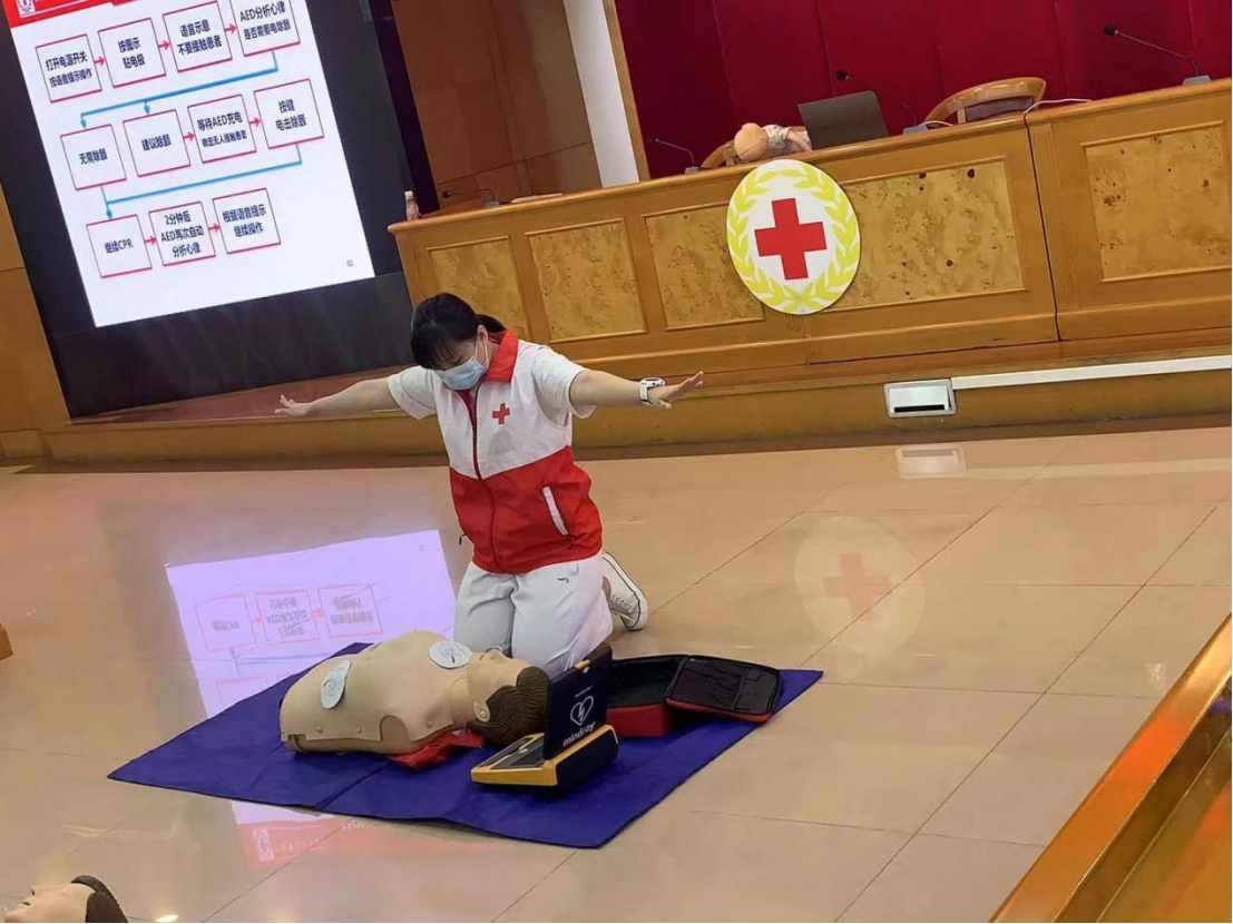 本次课程严格遵守防疫标准和红十字CPR+AED授课要求进行。当天授课的老师是资深讲师毛丽娴。毛老师有着丰富的教学经验,课堂上她运用真实案例启发参训的党员干部、职工,引导大家加深急救“黄金四分钟”的印象,同时将心肺复苏操作、AED使用方法、常见创伤包扎方法等内容生动形象的传授给大家。