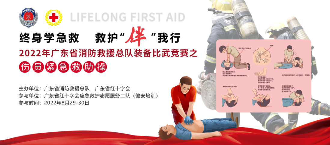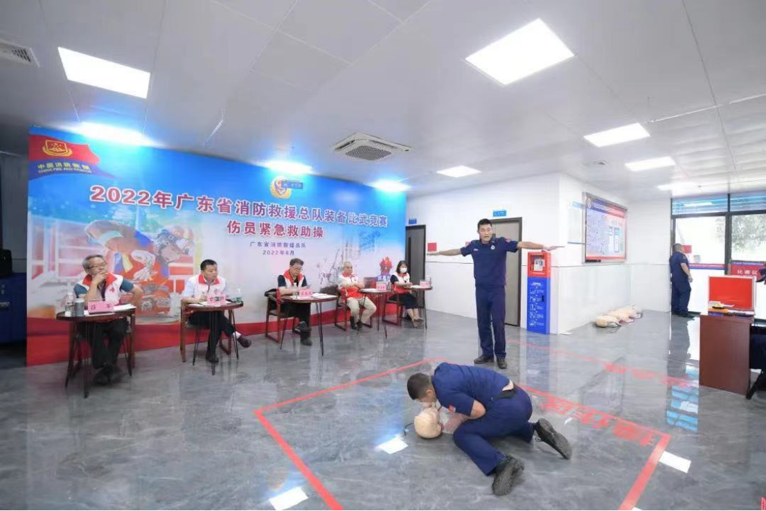2022年8月29-30日,广东省消防救援总队装备比武竞赛中首次举行伤员紧急救助操比赛项目。广东省红十字会在技术上、装备上等多方面给予大力支持。全省21支队伍参赛。该项目是模拟伤员心源性猝死情况下,队员利用AED自动体外除颤仪对假人开展CPR救助。“观察环境、判断意识、取来设备、交替按压”,操作过程中,既要保证救援程序的规范,还要确保按压位置、频次、幅度的精准。掌心下的胸腔起伏,不仅是专业的展现,更是在救援一线对生命的尊重。