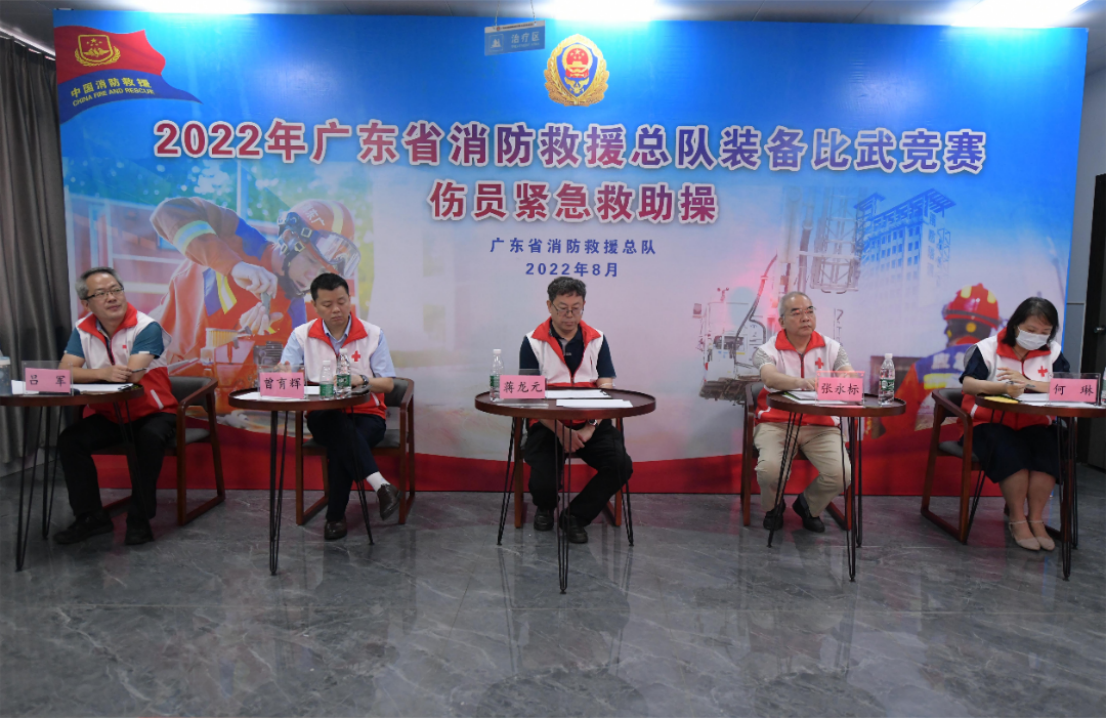 在赛前,广东省红十字救护师资对队员进行赛程答疑和培训。比赛中,省红十字会派出国家重点急诊住院医师规培基地、红十字会应急救护专家蒋龙元主任、广东药科大学附属第一医院急诊科曾育辉教授、中山大学第三附属医院急诊科张永标主任等5名专家担任评委,确保比赛的专业性、权威性。参赛队员精神饱满,教学语言生动形象,教学示范准确到位,展现了全省消防救援力量急救技能的高水准,为健康广东建设贡献一份力量。