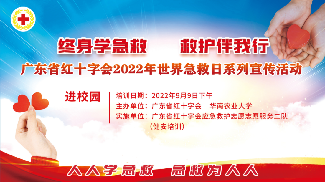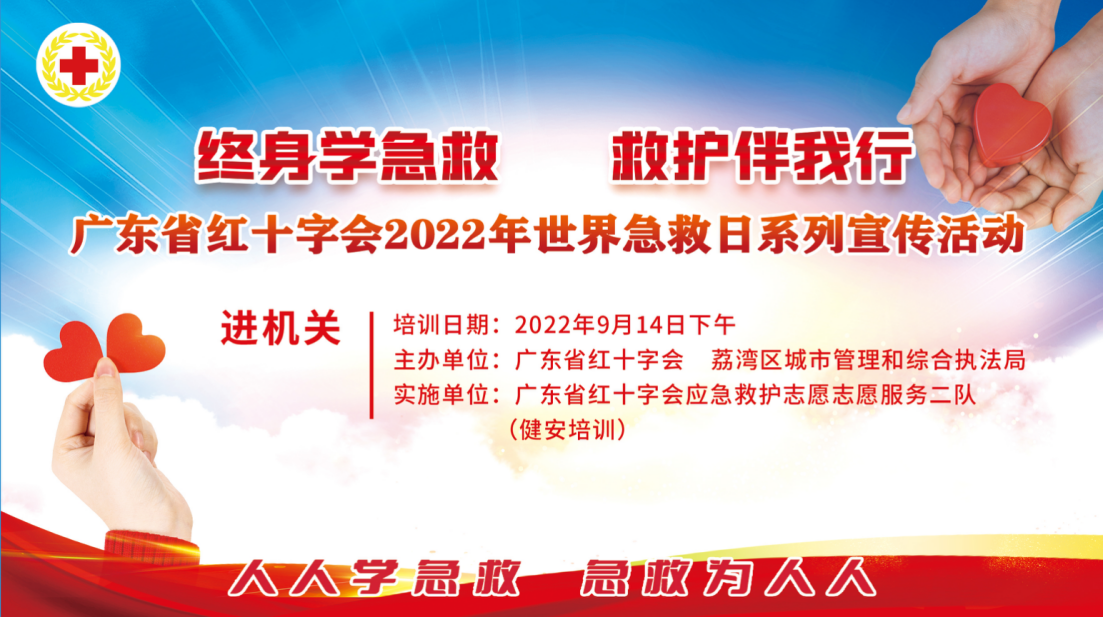 2022年9月10日是第23个世界急救日,今年“世界急救日”的主题是“终身学急救,救护伴我行”。为提升群众应急救护知识和技能普及水平,弘扬“人人学急救,急救为人人”的新时代文明新风尚和“人道、博爱、奉献”的红十字精神。广东省红十字会围绕“五进”(进社区、进企业、进农村、进学校、进机关)组织开展系列活动,省红十字会应急救护志愿服务二队积极参与活动。