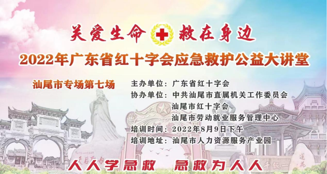 2022年8月9日下午,在广东省红十字会主办下,中共汕尾市直属机关工作委员会、汕尾市红十字会、汕尾市劳动就业服务管理中心于汕尾市人力资源服务产业园开展“关爱生命 救在身边” 2022年广东省红十字会应急救护公益大讲堂(汕尾市专场第七场)暨“我为群众办实事——应急救护进机关”主题实践活动。