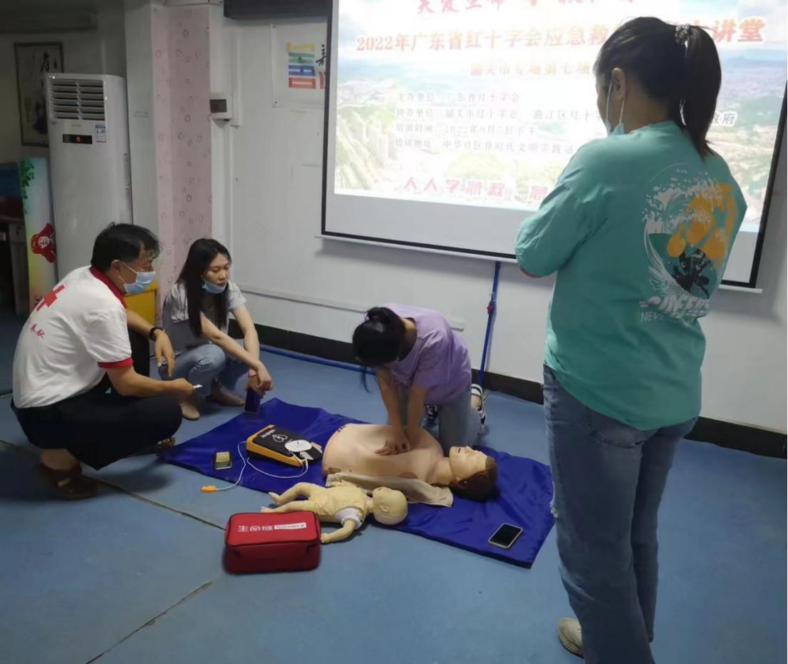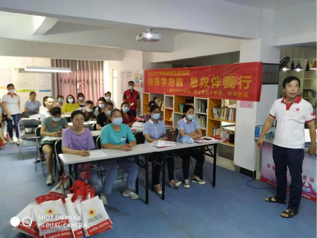 为进一步宣传与推动应急救护工作,提高辖区居民和志愿者的自救互救能力,推进新时代文明实践工作,弘扬红十字“人道 博爱 奉献”精神,2022年9月7日下午 ,由广东省红十字会主办,联合韶关市红十字会、 曲江区红十字会、中华社区共同在中华社区新时代文明实践站举办了2022年广东省红十字会应急救护公益大讲堂(韶关专场第七场)。课程由应急救护师资李恒老师主讲,吸引了36名党员、干部、志愿者和居民参加。